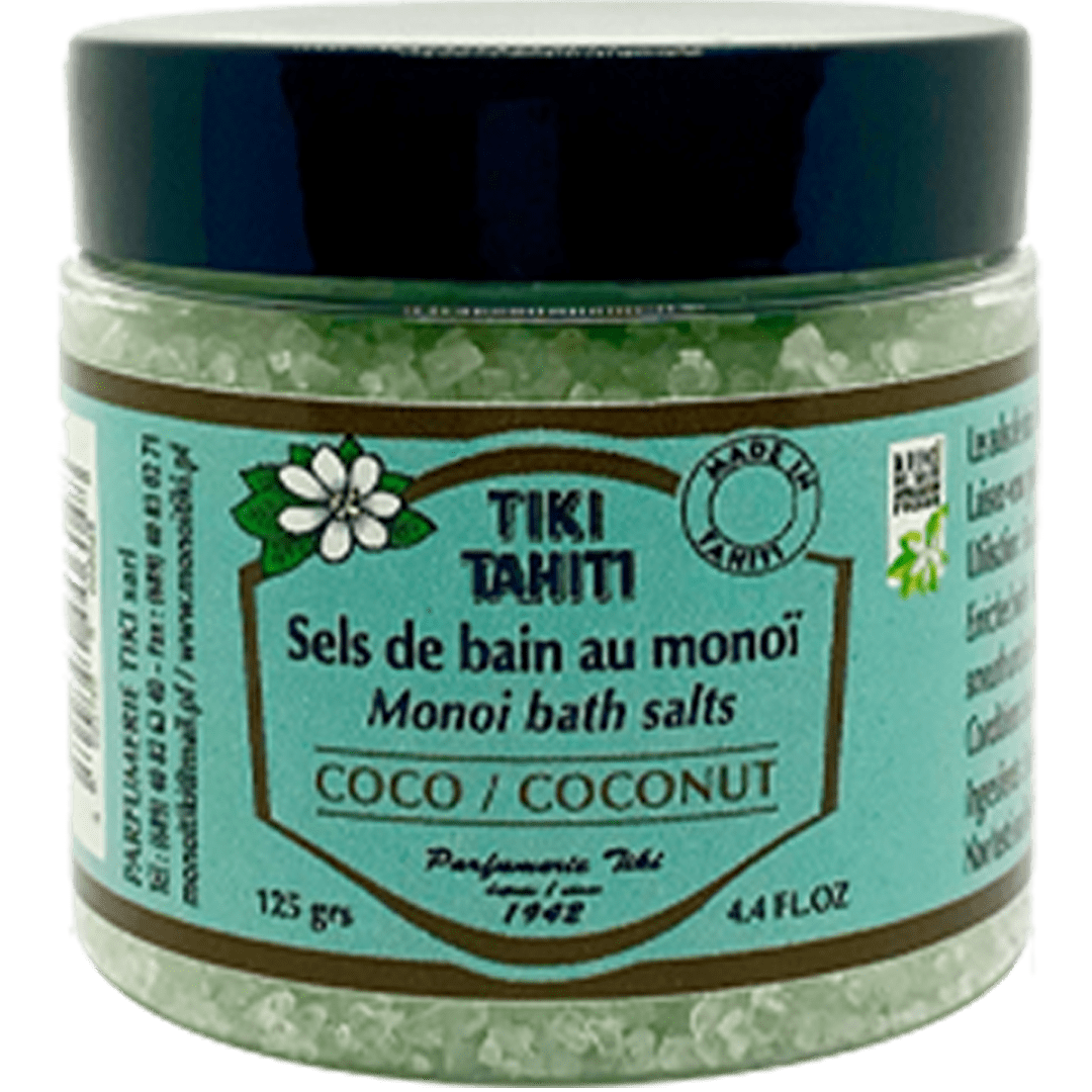 TIKI a créé ces sels de bain enrichis en Monoï de Tahiti A.O. TIKI. Vous retrouvez les vertus hydratantes et relaxantes du Monoï TIKI combinées avec la senteur du Coco dans une eau délicatement salée rappelant les lagons tropicaux.